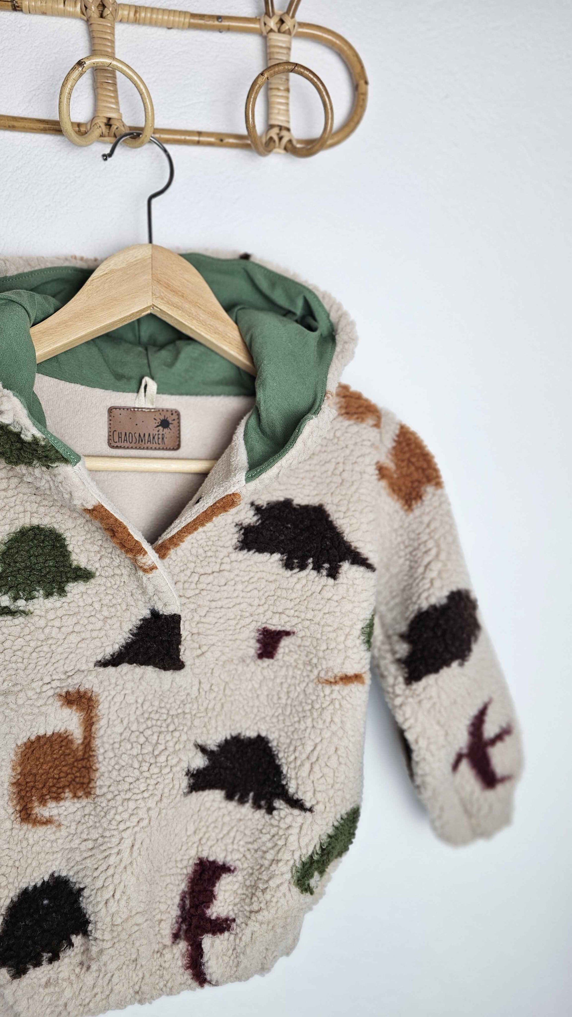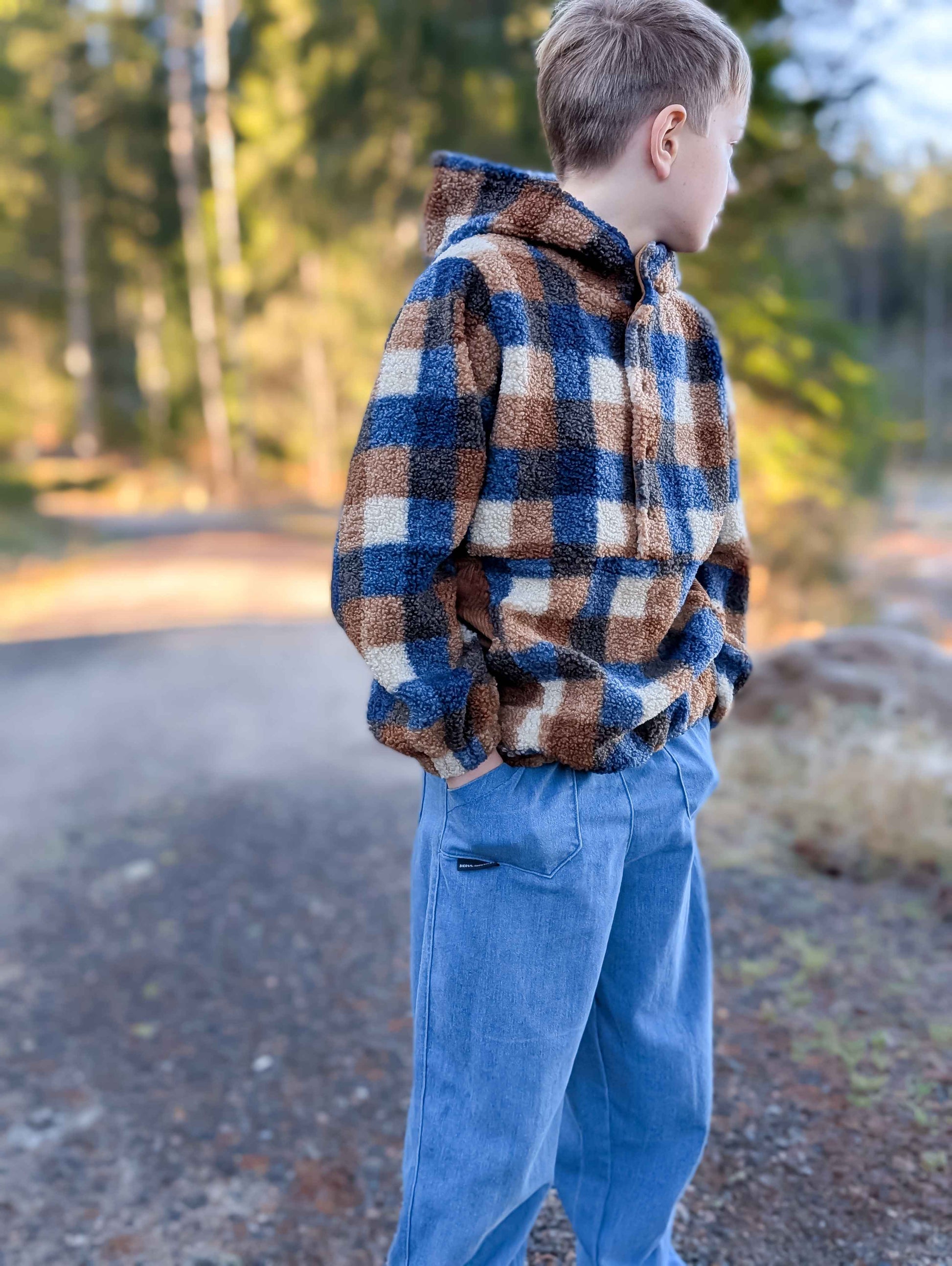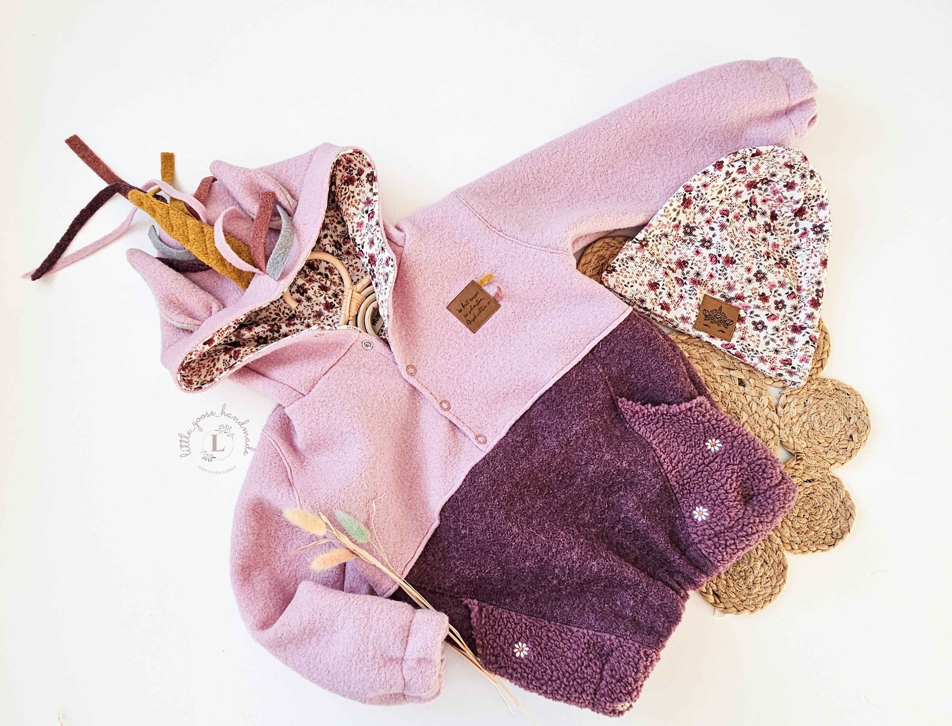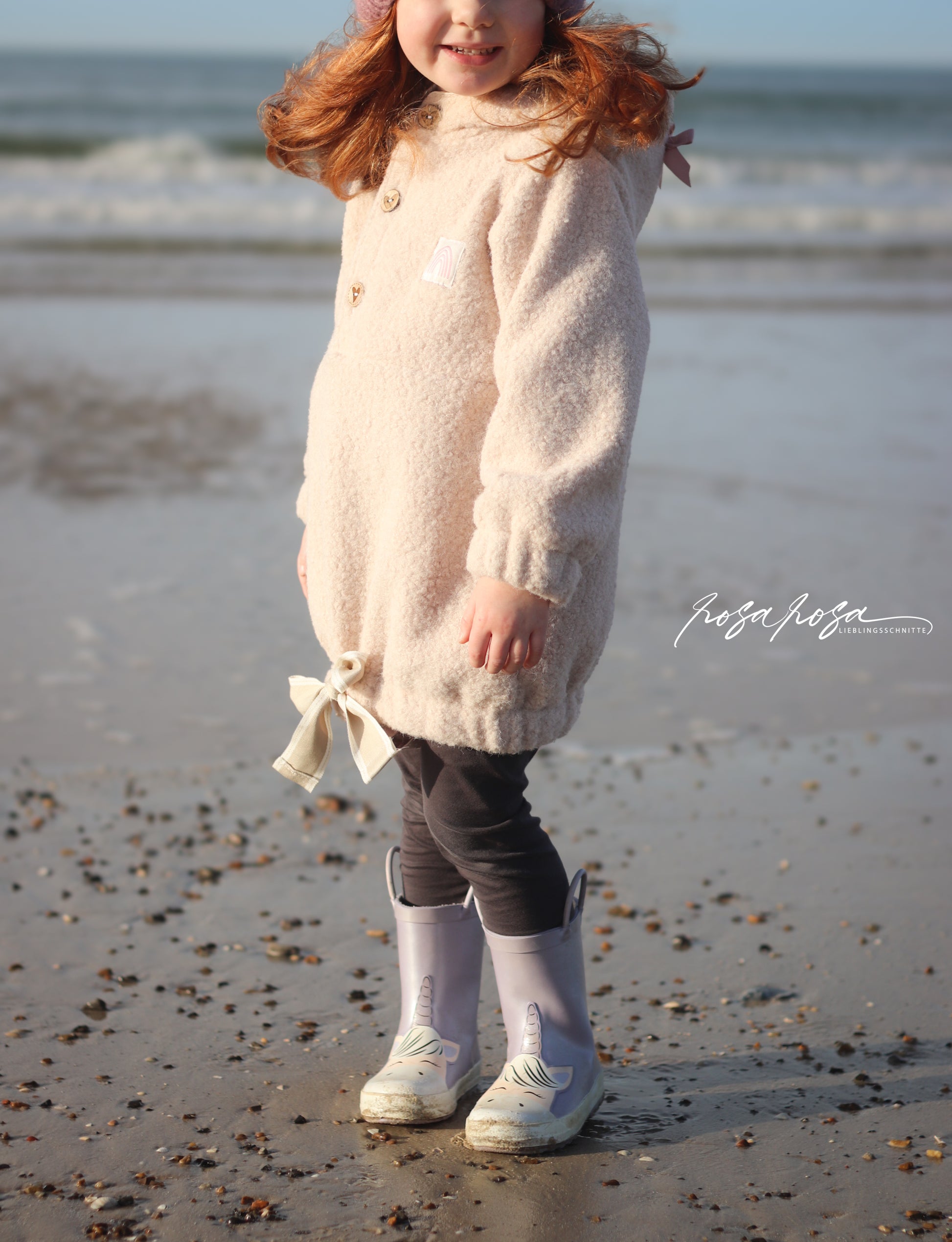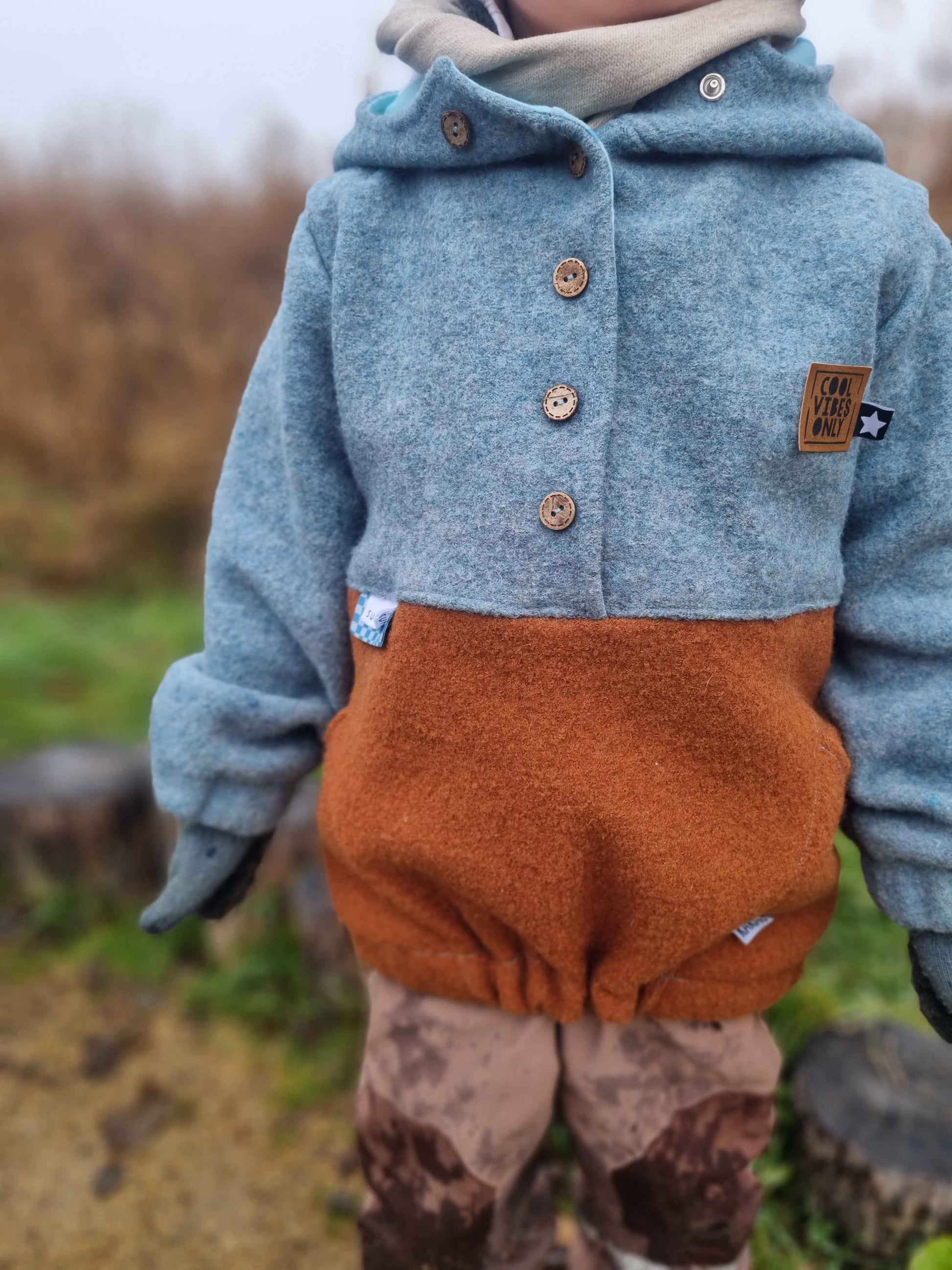 Der Schnitt ist für mittelschwere, leicht elastische Stoffe wie Wollwalk, Baumwollfleece, Bouclé, Teddyplüsch und ähnliche Materialien ausgelegt. Diese Stoffe halten angenehm warm, ohne aufzutragen, und sorgen für ausreichend Bewegungsfreiheit im Alltag.